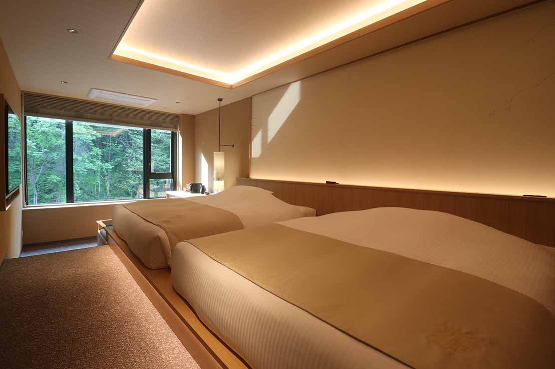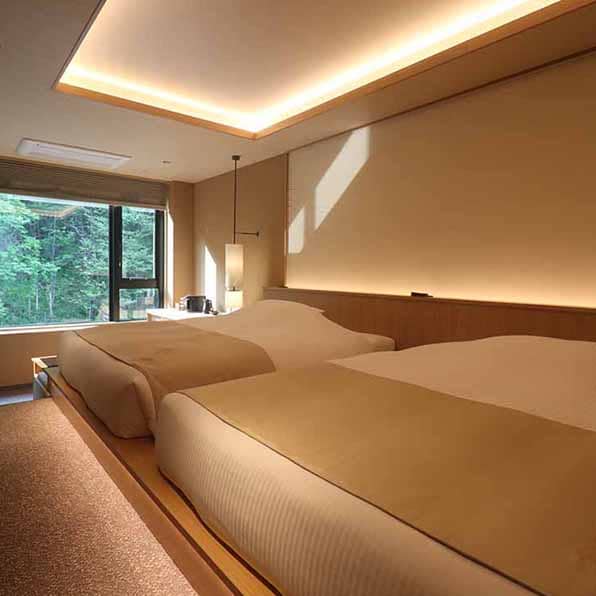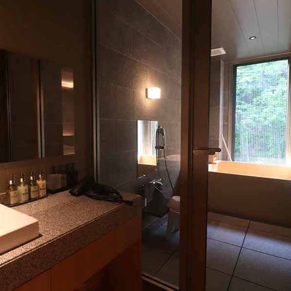 コンパクトながら源泉100パーセントの湯を24時間お楽しみいただける温泉を備えたお部屋です。全て山側(朝日岳)に面しています。運が良ければ鹿やリスと会えるかもしれません。